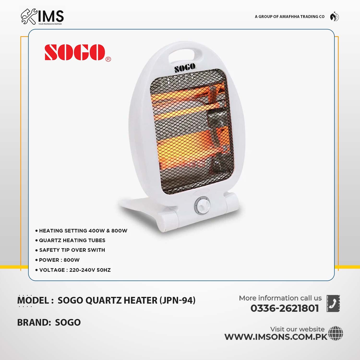 The Sogo Quartz Heater (Model JPN-94) provides quick, efficient, and safe heating for your home or workspace. Designed with dual quartz heating elements, it delivers instant warmth while maintaining energy efficiency.